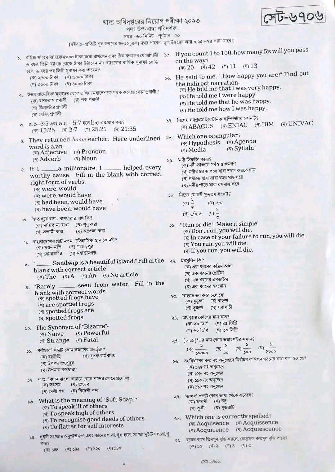 খাদ্য অধিদপ্তর উপ খাদ্য পরিদর্শক পরীক্ষা প্রশ্ন