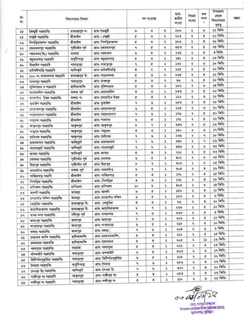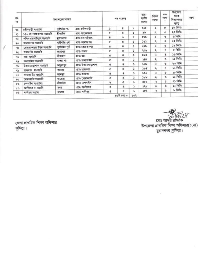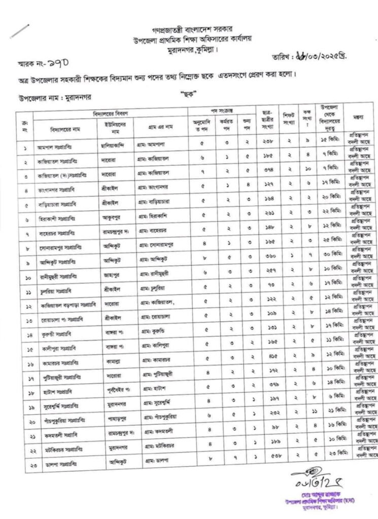 প্রাইমারির শূন্য পদের তালিকা ২০২৫ কুমিল্লা মুরাদনগর উপজেলা