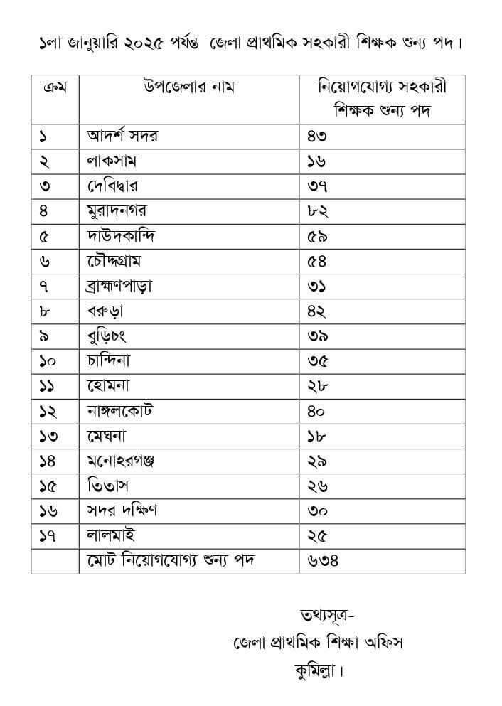 প্রাইমারির শূন্য পদের তালিকা ২০২৫ কুমিল্লা বিভাগ